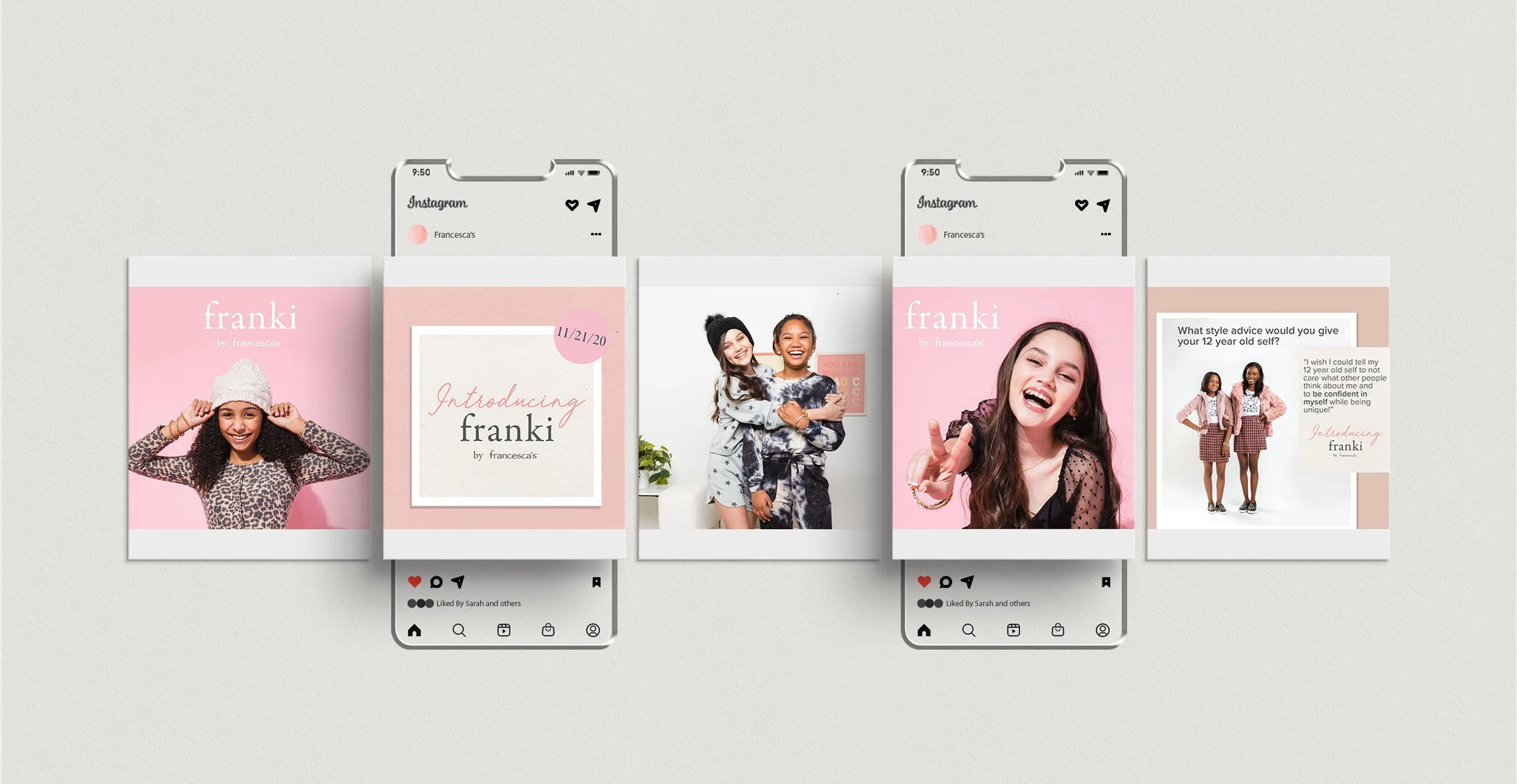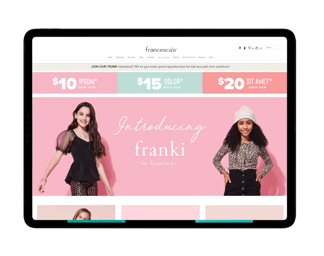 For this launch I designed a wide range of assets, including branded decks for internal communications in the process of developing Franki, in-store signage, digital banners, a landing page, emails, and social media graphics. The assets capture the essence of Francesca’s funneled into the tween brand, creating a consistent and recognizable visual language for this new category.